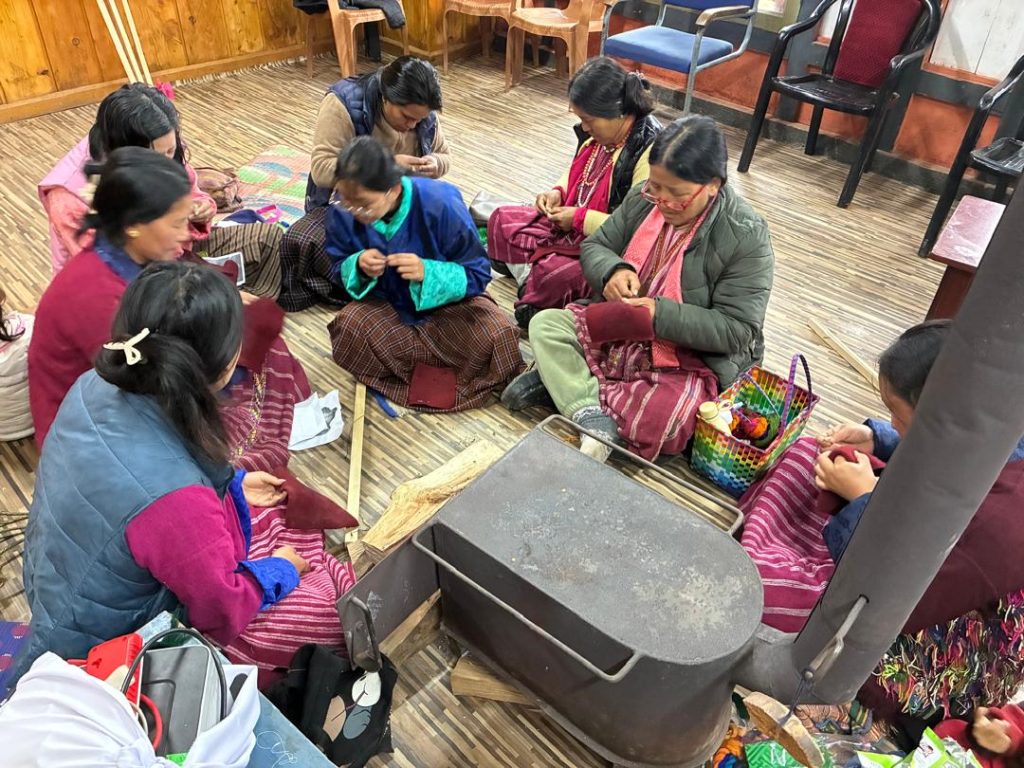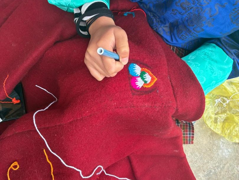 To preserve and promote the region’s unique identity, the embroidery designs feature Bhutanโs Blue Poppy, Red Panda, and local birds, helping build a distinctive Sakteng brand. Participants are also practicing embroidery on their traditional gho, which contributes to the preservation and promotion of their cultural heritage.